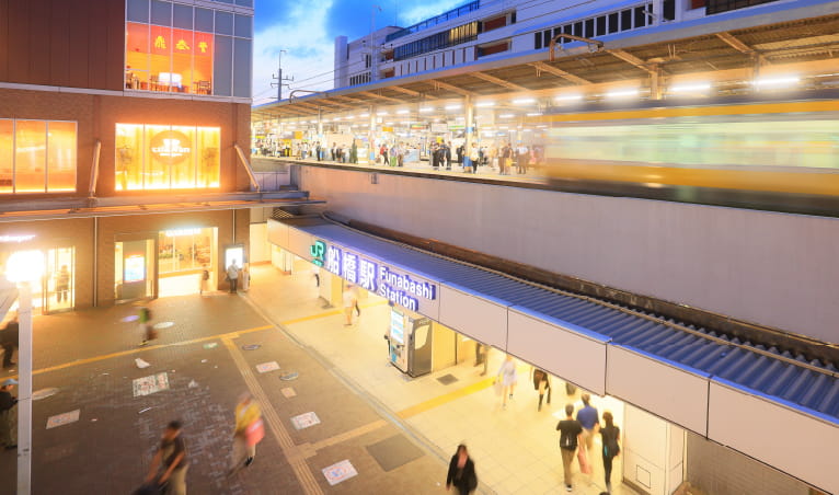 JR総武線快速、JR中央・総武線各駅停車、東武アーバンパークライン「船橋」駅と京成本線「京成船橋」駅を利用できる2駅4路線。