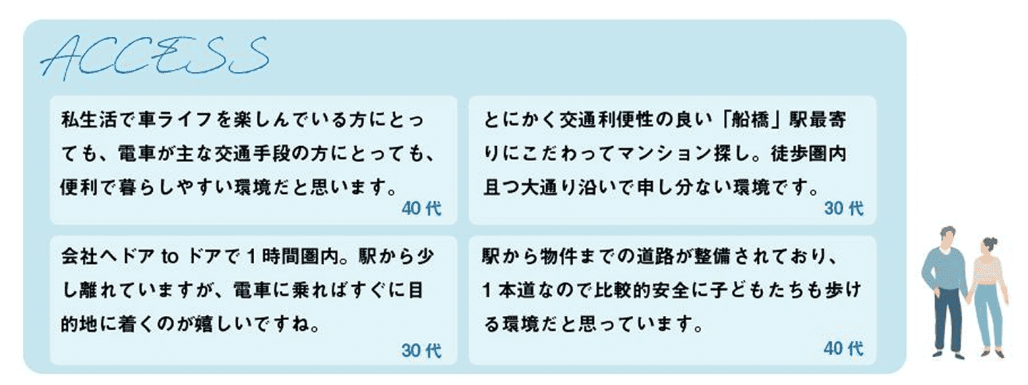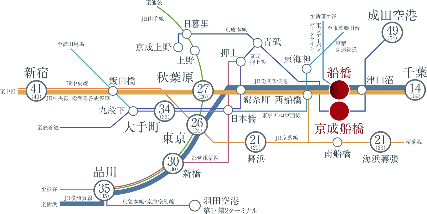 JR総武線快速、JR中央・総武線各駅停車、東武アーバンパークライン「船橋」駅と京成本線「京成船橋」駅を利用できる2駅4路線。多方面に伸びるビッグターミナルから、通勤・通学のほかレジャースポットへも軽やかにつながります。