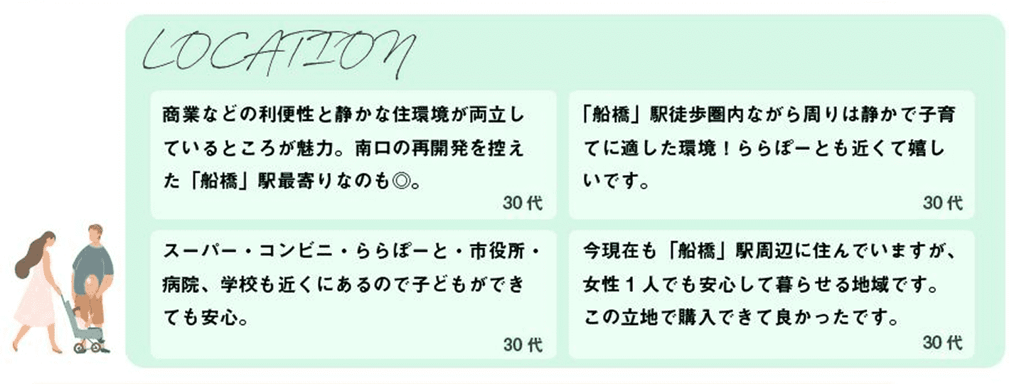 「船橋」駅の賑わいはもちろん、物件周辺の日常使いできる商業・公共施設が豊富なことも評価ポイントに。このような利便性を得ながらも物件周辺は落ち着いた環境が広がっています。また徒歩13分の場所には「三井ショッピングパーク ららぽーとTOKYO-BAY」もあり、休日のお出かけに困りません。