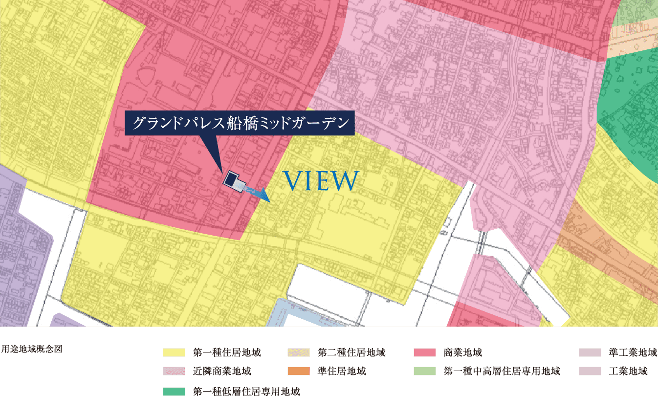 計画地の道路を挟んで東南側に広がる街区一帯(道路沿いは商業地域)は、法令によって住居の環境が守られる「第一種住居地域」に指定されています。