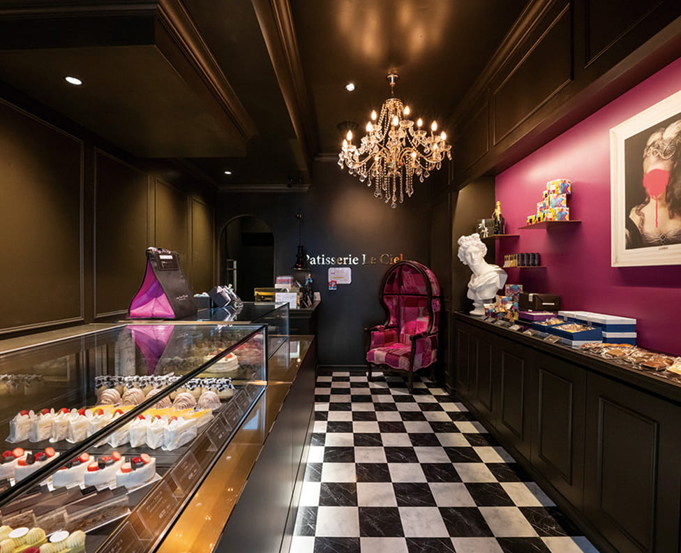 重厚感のあるシックな外観が印象的。店内のショーケースには旬のフルーツを使った美しいケーキが並びます。フィナンシェやガレットブルトンヌなど、思わず誰かにあげたくなる焼き菓子も充実。